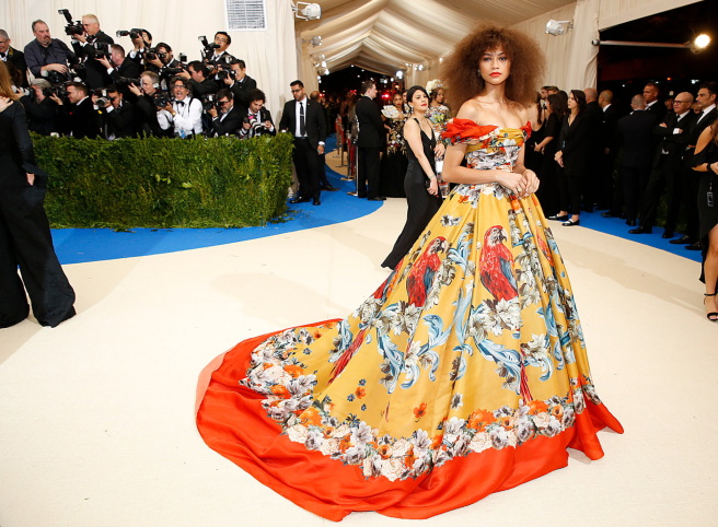 I absolutely loved Zendaya’s dramatic parrot gown, along with the gold and coral combination, it gives off the glamorous vibe & the dress structure of the renaissance, such a colorful and fun look! I love this voluminous gown and the off the shoulder look! Score!