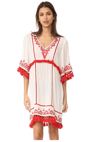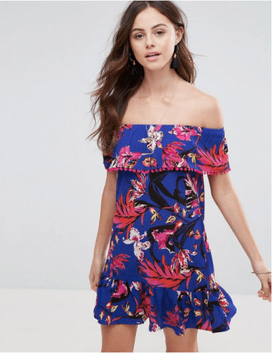 The Floral Print Pom Trimmed Off the Shoulder Dress is a beautiful & colorful print that showcases a tribal vibe!