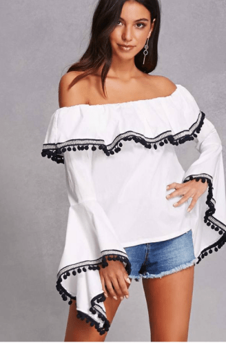 The Pom Ruffle Off the Shouler Bell Sleeve Top is adorable and makes you want a shake and/or dance a little just to see the pom poms move! Go ahead, you know you want to!